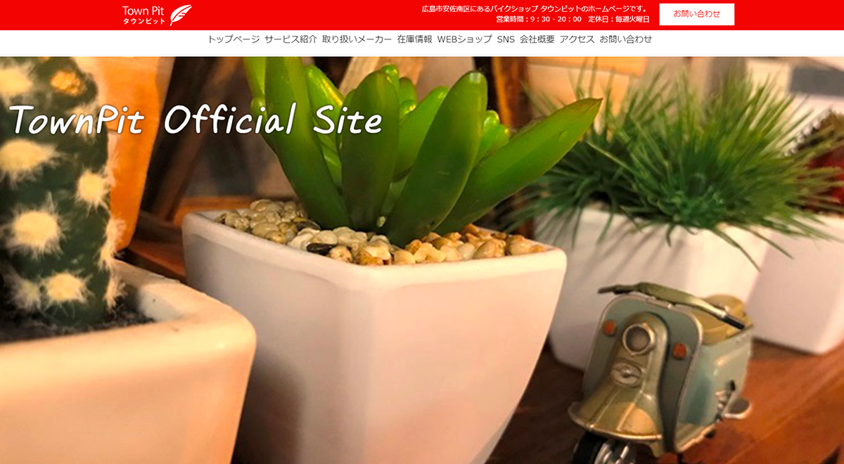 TownPit タウンピット|広島県広島市のバイク販売店 広島市安佐南区にあるバイクショップ タウンピットのホームページです。 営業時間:9:30 - 20:00 定休日:毎週火曜日 お問い合わせ トップページ サービス紹介 取り扱いメーカー 在庫情報 WEBショップ SNS 会社概要 アクセス お問い合わせ 実際のスライダーの動きは、プレビュー/公開ページでご確認ください サービス紹介 修理のことならスクーターから大型まで絶対の自信あり! 当店は、SUZUKI、YAMAHA、KYMCO、 PEUGEOT MOTOCYCLES の正規代理店です。 メーカー(スズキ2輪)にてサービス歴18年。 その間にサービス技能全国優勝の経験を持ち、修理のことならスクーターから大型まで絶対の自信があります!! 店内はいつでもくつろげる空間をご用意。 用品コーナーでは、ヘルメット、リアBOXの他、レインウエアやグローブといったライディングギアからオイル、ロックなども充実のラインナップを展示中! WEBショップでもご購入いただけます。 整備工場では、各車種専用工具を多数所有。 確実・安全・安心の整備を心掛けています。 バイクは、定期的な点検・整備で驚くほど 長く安心して乗ることができますよ! バイクのことならタウンピットへ! 表示したいテキスト 取り扱いメーカー ▼SUZUKI▼ ▼YAMAHA▼ ▼ KYMCO ▼ ▼ PEUGEOT MOTOCYCLES ▼ 在庫情報 読込中 当店の在庫へ WEBショップ SNS We’re putting the Weekend Hashtag Project on hold this weekend. Instead, we’re challenging people around the world to participate in the 10th Worldwide InstaMeet! Grab a few good friends or meet up with a larger group in your area and share your best pho...