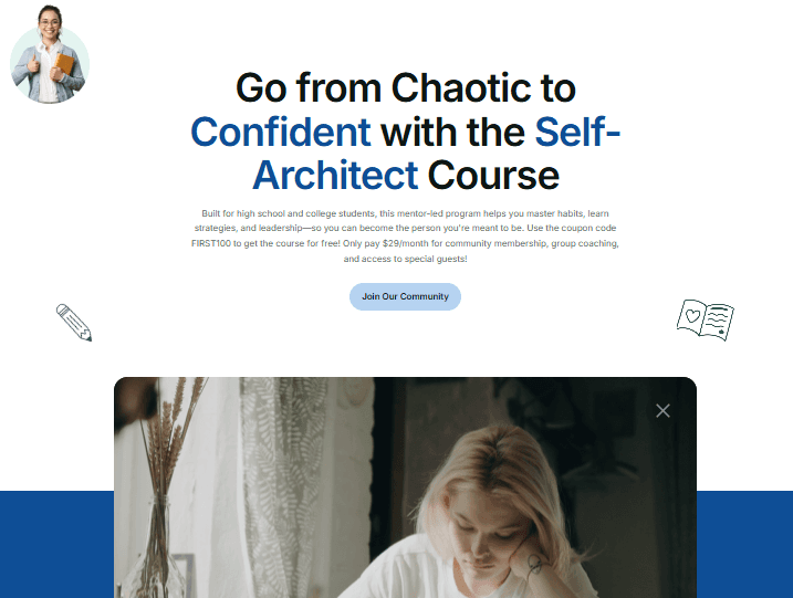 Velle Logos Home Pages Contact About Us Join Our Course Go from Chaotic to Confident with the Self-Architect Course Go from Chaotic to Confident with the Self-Architect Course Built for high school and college students, this mentor-led program helps you master habits, learn strategies, and leadership—so you can become the person you're meant to be. Use the coupon code FIRST100 to get the course for free! Only pay $29/month for community membership, group coaching, and access to special guests! Built for high school and college students, this mentor-led program helps you master habits, learn strategies, and leadership—so you can become the person you're meant to be. Use the coupon code FIRST100 to get the course for free! Only pay $29/month for community membership, group coaching, and access to special guests! Join Our Community Join Our Community Why choose this course. Why choose this course. It’s not just a course. It’s a transformation. You’ll ge...