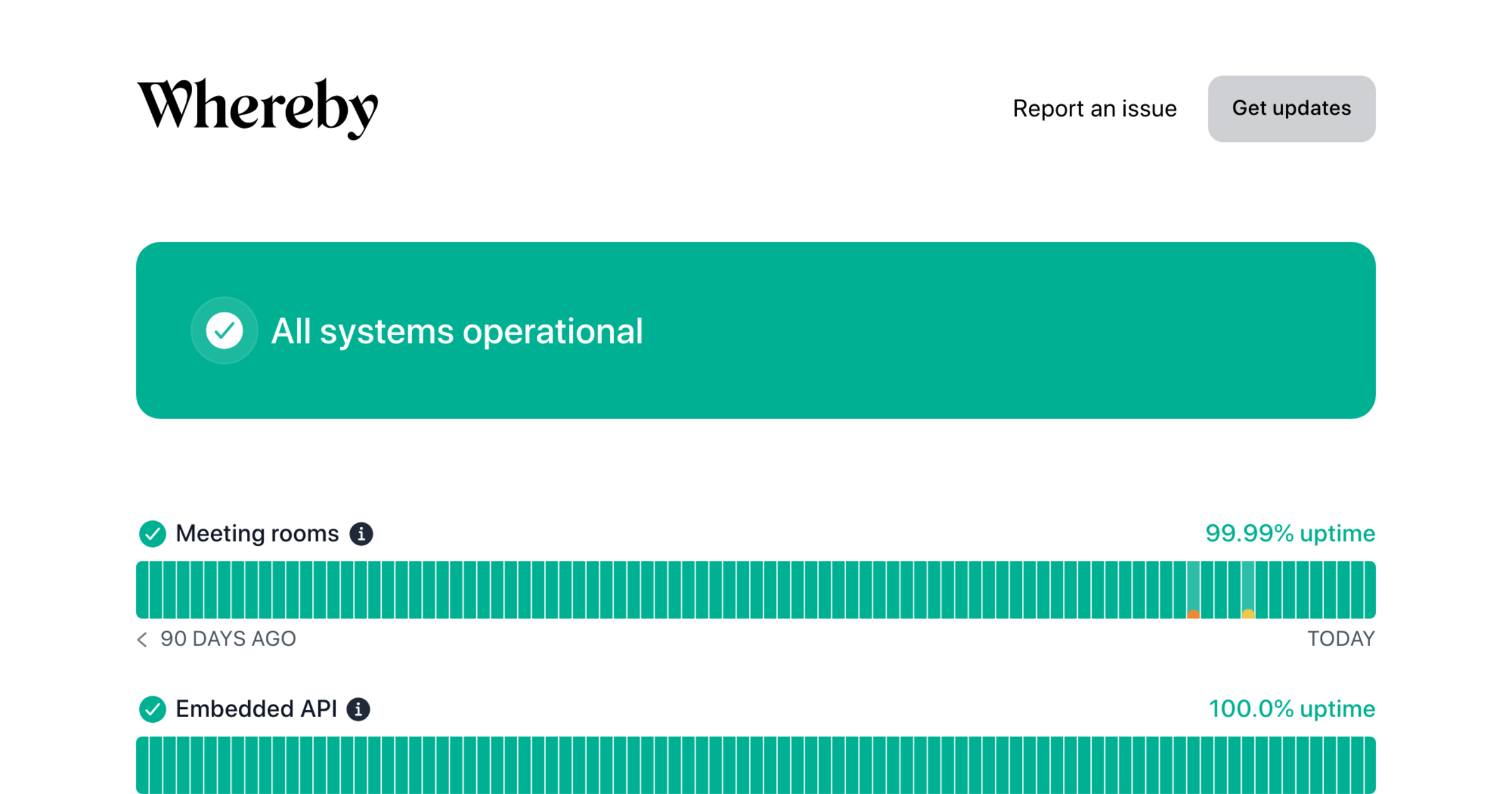 Whereby - Status Report an issue Get updates Email Slack Microsoft Teams Google Chat Webhook RSS Atom API Report an issue Get updates All systems operational Meeting rooms 100.0 %   uptime 90 days ago Today Embedded API 100.0 %   uptime 90 days ago Today Admin dashboard 100.0 %   uptime 90 days ago Today whereby.com 100.0 %   uptime 90 days ago Today Recent notices No notices reported for the past 7 days Show notice history Show notice history Powered by  Instatus