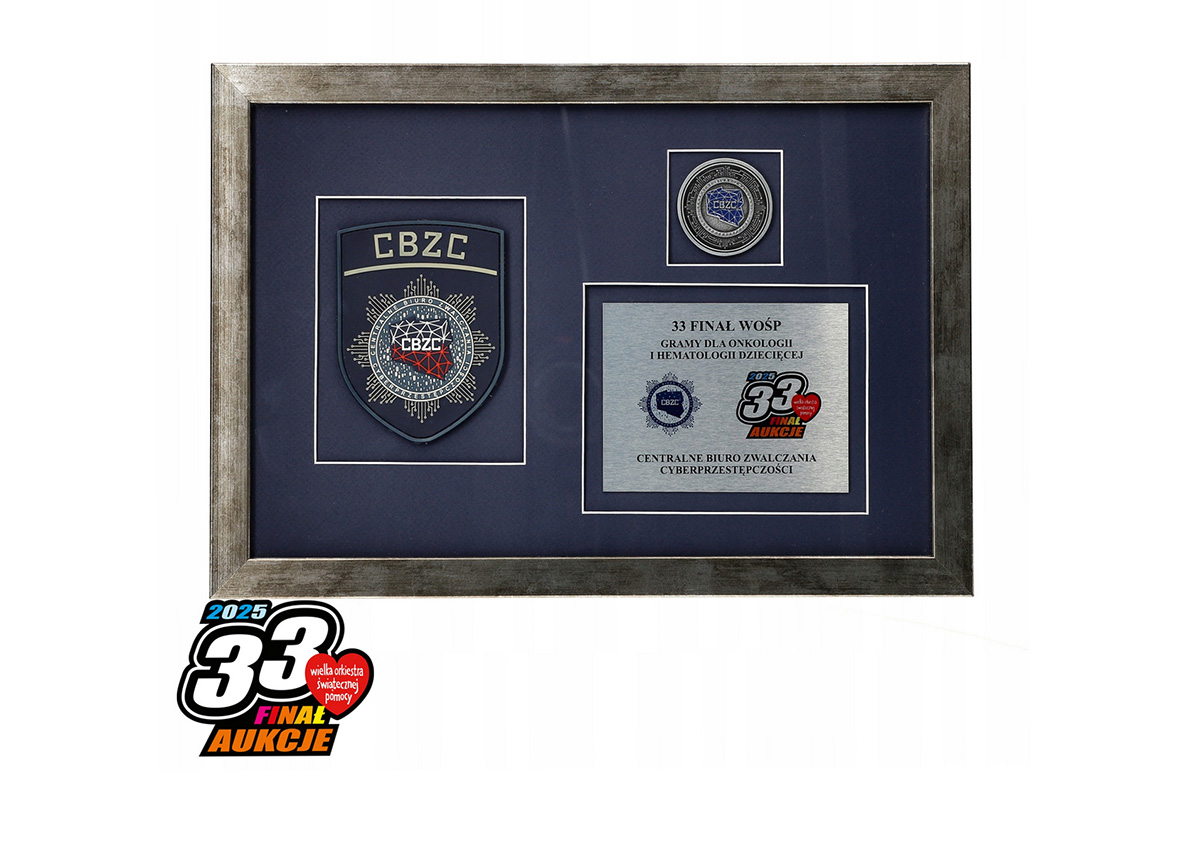 Centralne Biuro Zwalczania Cyberprzestępczości włączyło się w charytatywną akcję, Wielkiej Orkiestry Świątecznej Pomocy, której celem jest zbiórka pieniędzy dla onkologii i hematologii dziecięcej. W ramach 33. Finału WOŚP przekazaliśmy na licytację kolekcjonerski zestaw składający się z naszywki, „coina” i pamiątkowej tabliczki z napisem: "Gramy dla onkologii i hematologii dziecięcej". Zapraszamy i zachęcamy do licytacji!