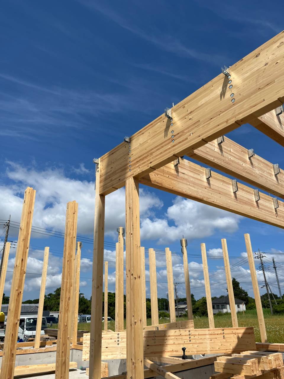 また、基礎部分には樹脂製の「基礎パッキン」も併用し、通気性を確保しつつ湿気対策も万全。柱が立ち上がった後も、すべての接合部に強固な金物を用いており、緻密な施工がなされています。