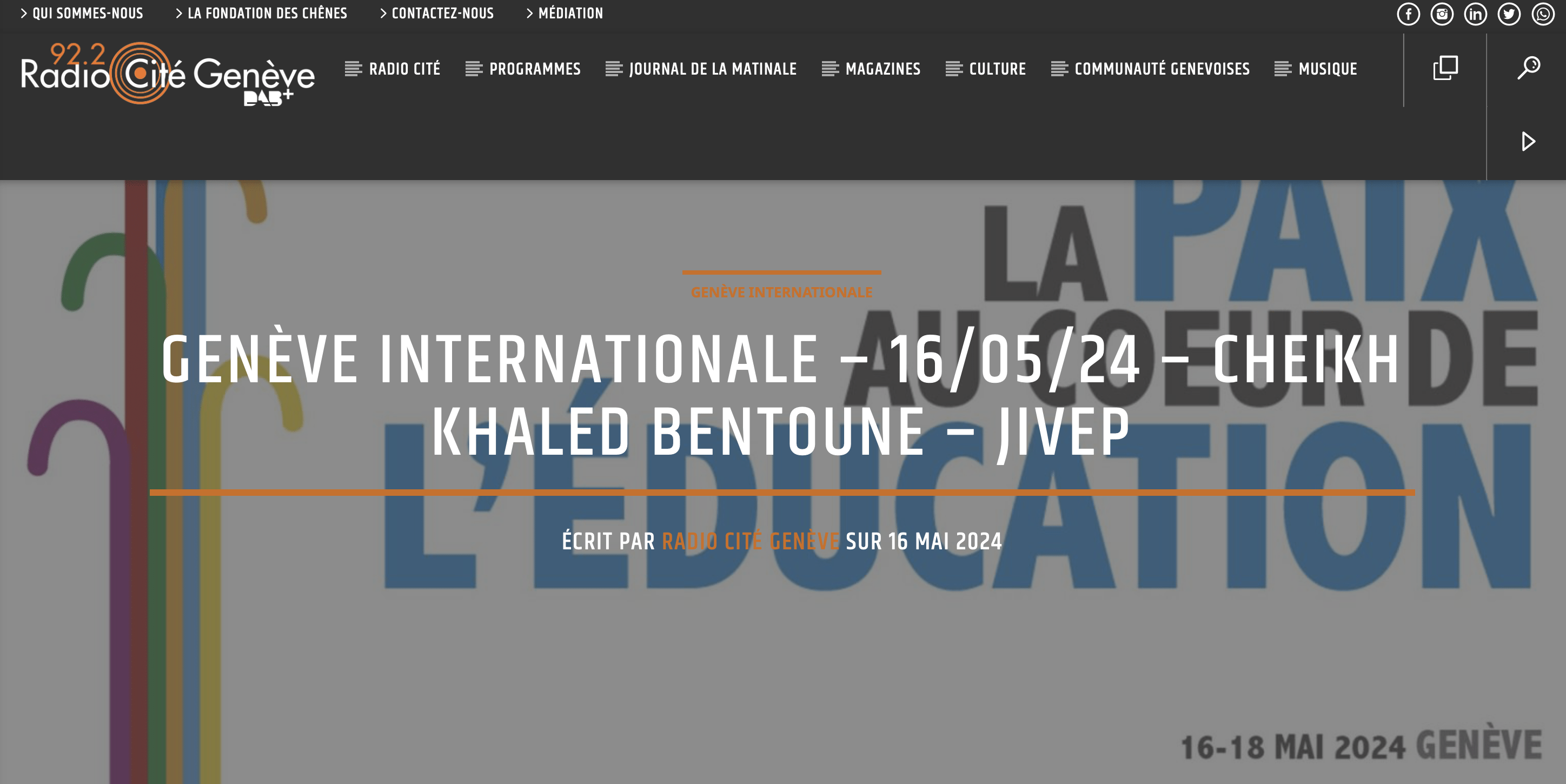 GENÈVE INTERNATIONALE – 16/05/24 – CHEIKH KHALED BENTOUNES – JIVEP ÉCRIT PAR RADIO CITÉ GENÈVE SUR 16 MAI 2024 Le 16 mai c’est La Journée Internationale du Vivre Ensemble en Paix 2024 votée par l’ONU en 2017 et dont Genève accueille la 7e édition cette année après Paris, Cordoue, pour ne citer que ces 2 villes. Cette journée a été initiée par le Cheikh Khaled Bentounes qui incarne un engagement profond en faveur de la paix, de la tolérance et du vivre-ensemble. En tant que leader spirituel soufi, son parcours est marqué par un dévouement sans faille à la promotion du dialogue interculturel et de la compréhension mutuelle entre les peuples. À travers son engagement humanitaire et ses initiatives éducatives, Cheikh Khaled Bentounes inspire des millions de personnes à travers le monde à embrasser les valeurs universelles de paix, de compassion et de fraternité. Entretien avec Cheikh Khaled Bentounes, initiateur de la Journée Internationale du Vivre Ensemble en Paix. https://16...