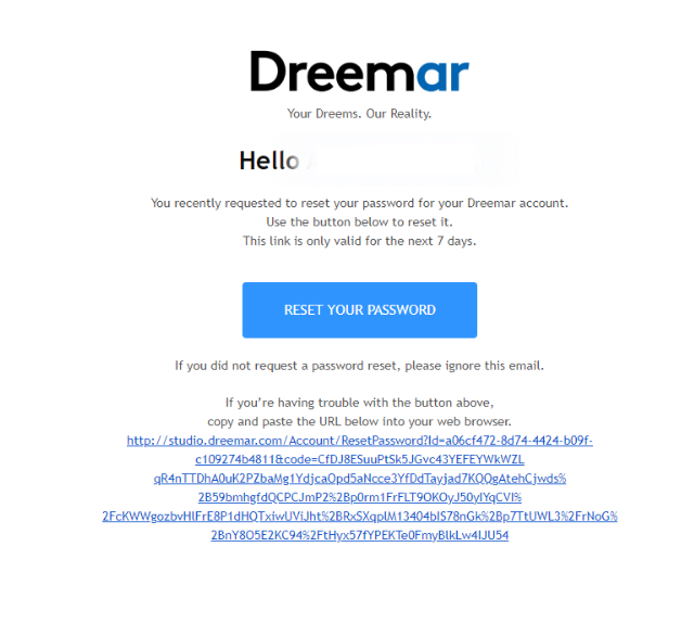 Can't Sign in to Dreemar Admin If you can't sign in to your Dreemar account, follow the instructions for help getting back in to your account.To reset your password:Click Forgot your password? in the Dreemar Admin's log-in page.Enter your email address associated to your Dreemar account and click Submit.Access your email's inbox and look for an email from do-not-reply@dreemar.com and with subject of Reset Dreemar's account password.Reset your password as prompted. REMEMBER:Password reset email will only be sent to the email account registered to Dreemar. This means that if you entered a different email address not registered to Dreemar in the Forgot your password? page and it prompted you Forgot password confirmation: Please check your email to reset your password, you will still not receive the password reset email. Password reset link is only valid for 7 days from the time of request.In setting up a new password, it must be at least 6 and at a max of 100 characters.