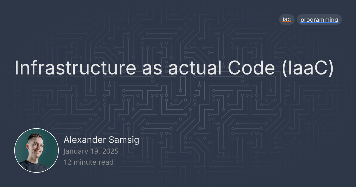 Infrastructure as actual Code (IaaC)January 19, 202512 minute read#iac#programmingSetting the Scene My first introduction to Infrastructure as Code (IaC) must have been back in 2016. We were exploring AWS for the first time in my team, and we were using CloudFormation with its JSON-formatted templates. I'm pretty sure this was before the YAML-formatted templates were even a thing since that wasn't launched until September 2016. Anyway, as a developer, I'm used to writing code. I follow "best practices", such as Don't Repeat Yourself (DRY), by using variables, methods, and abstracting where necessary. I also try to keep it as easy to read, understand, and maintain as possible. Sometimes, that includes comments in my code, usually to explain the rationale behind certain choices or highlight potential gotchas. Yes, yes, not everything should be abstracted, You Aren't Going to Need It (YAGNI), and all that. Well, you see... The problem with most IaC solutions is that they are actually conf...