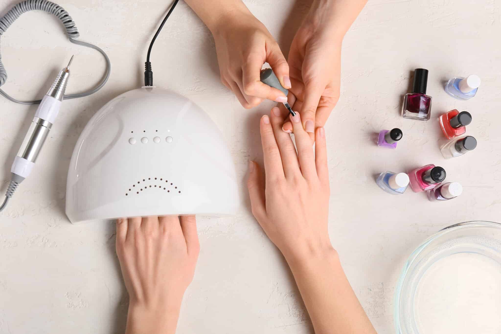 nail salon equipment being used by a nail professional on clients' hands