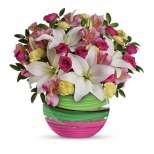 BACK DescriptionCelebrate the joy of spring with a burst of delightfully bright blooms beautifully arranged in a richly striped vase. It is the perfect choice for season. Hot pink spray roses, white asiatic lilies, pink alstroemeria and yellow miniature carnations are accented with assorted greenery. Delivered in a Paint It Pastel vase. Product ID T13E200B 12 1/2" W x 12" H 's Perfect Bouquet Teleflora's Paint It Pastel BouquetTop Reasons to Buy 100% SATISFACTION GUARANTEEWe take pride in our work, and stand behind every arrangement we deliver. If you are not completely satisfied with your order, please contact us so that we can make it right. WE ARE A REAL LOCAL FLORISTWe are proud to serve our local community in joyful and in sympathetic times. You can feel confident that you will get an amazing arrangement that is supporting a real local florist! 100% FLORIST DESIGNEDEach arrangement is hand-designed by floral artists, bringing a unique blend of creativity and emotion. You...