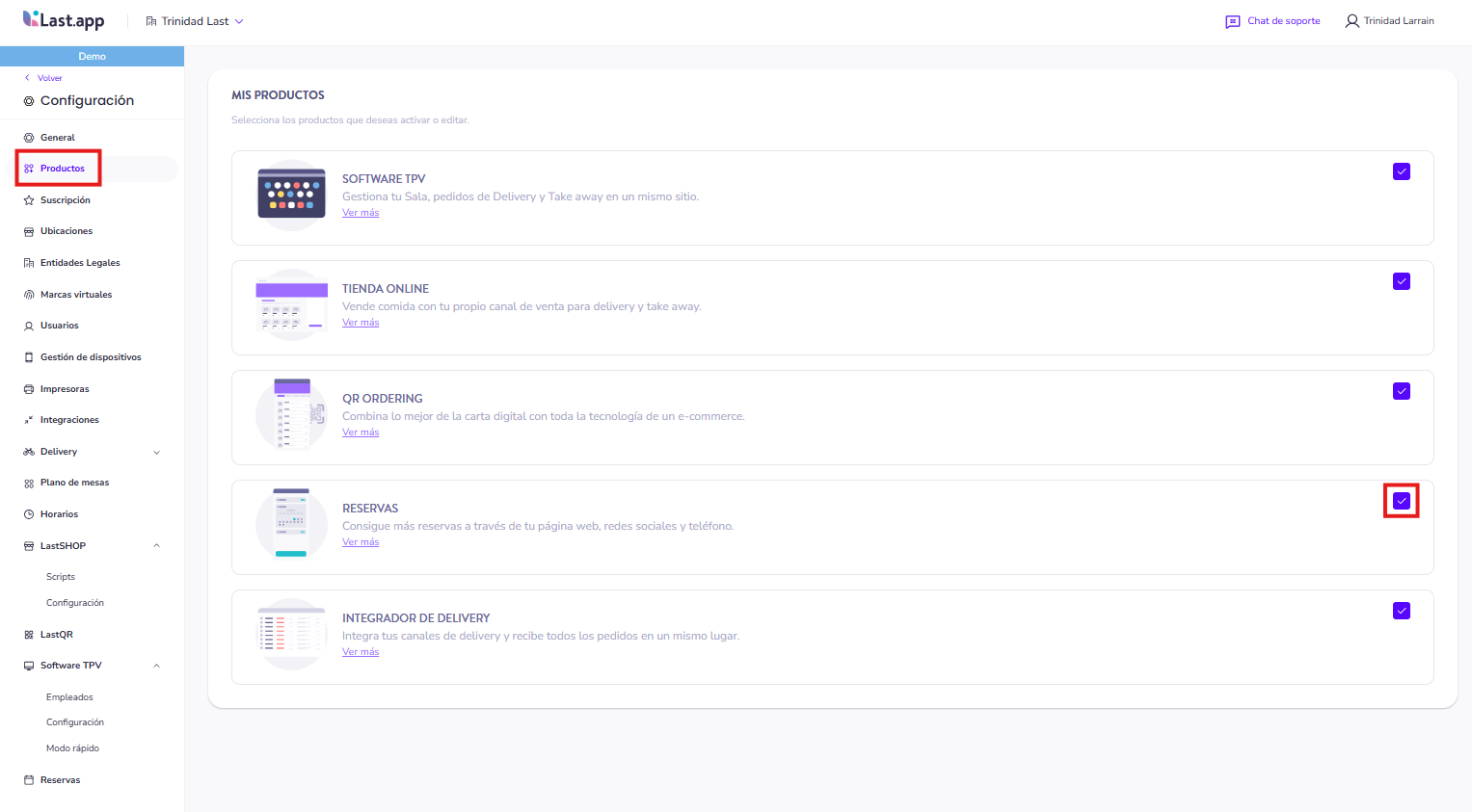 Integraciones: Covermanager ¿Cómo integrar CoverManager con Last.App?Para vincular tu gestor de reservas CoverManager con Last.app, solo tienes que seguir estos tres pasos:Paso 1: Activar el módulo de reservas en Last.AppAccede al apartado "Productos" desde tu panel de administración.Activa el módulo de reservas en la ubicación deseada.Paso 2: Configuración del plano de mesasEs fundamental que el plano de mesas en Last.app sea idéntico al que tienes en CoverManager. Esto incluye:Nombres de las mesasPosiciónCapacidad de comensalesIMPORTANTE: La coincidencia debe ser exacta en ambas plataformas.Edición de mesas en CoverManagerEdición de mesas en Last.AppPara configurar las mesas en Last.App puedes consultar este artículo: Aprende como crear o modificar mesas en Last.app.El nombre de las mesas y la cantidad de comensales deberá tener una coincidencia exacta tanto en Last.App como en CoverManager.Plano en CoverManager configurado correctamente:Plano en LastApp configurado correctamente:Pas...
