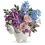 BACK DescriptionMake their day magical with our Enchanting Pastels Unicorn Bouquet. Dreamy pink roses, lavender stock, and delicate spray mums overflow from a hand-painted ceramic unicorn keepsake—complete with golden horn and rainbow mane. Perfect for welcoming a new baby, celebrating a child’s birthday, or sending a whimsical “just-because” surprise. Designed in-store and available for reliable same-day flower delivery throughout Wilmington-Brandywine and nearby towns. Product ID TNB16-1AD 's Perfect Bouquet Enchanting Pastels Unicorn Bouquet TFTop Reasons to Buy 100% SATISFACTION GUARANTEEWe take pride in our work, and stand behind every arrangement we deliver. If you are not completely satisfied with your order, please contact us so that we can make it right. WE ARE A REAL LOCAL FLORISTWe are proud to serve our local community in joyful and in sympathetic times. You can feel confident that you will get an amazing arrangement that is supporting a real local florist! 100% F...