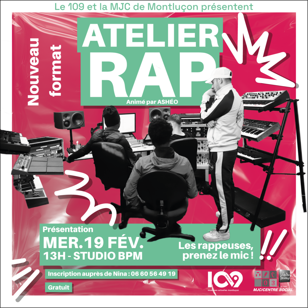 Atelier Rap: Nouveau projet au 109 en partenariat avec la MJC de Montluçon 17.12.2024 Action culturelleLe 109 Ça repart pour un tour ! Après trois éditions réussies, le projet Rap & Beatmaking revient en 2025 avec un tout nouveau format « Atelier Rap ». En partenariat avec la MJC de Montluçon, le 109 lance un dispositif d’accompagnement à partir de février pour tous les jeunes rappeurs de Montluçon et des environs. Débutant ou confirmé, tout le monde a sa place dans ce projet qui réunit pratique artistique, création et scène. Ashéo en capitaine de bord C’est Ashéo, rappeur aguerri et habitué des ateliers avec les jeunes, qui sera à la barre de cette nouvelle aventure. Avec sa pédagogie et son expérience scénique (premières parties d’IAM et Bigflo & Oli, rien que ça !), il proposera un accompagnement sur mesure à travers des ateliers bimensuels dans les studios du 109. Un nouveau format pour aller plus loin Les participants auro...
