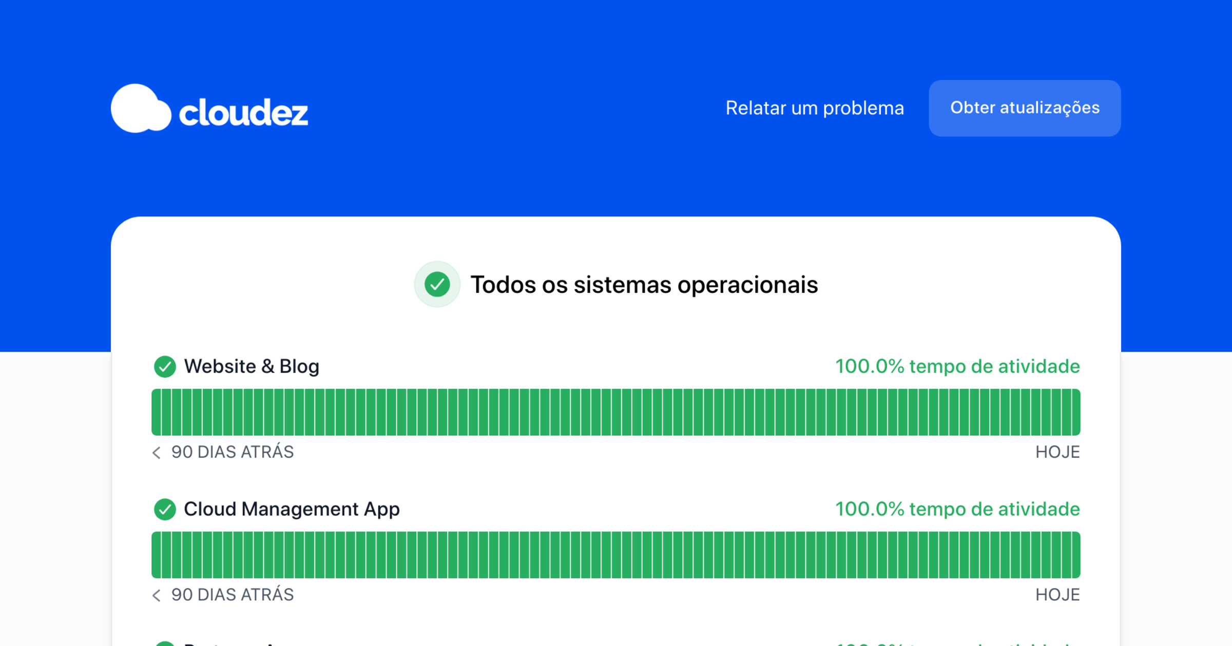 Website & Blog - OperacionalWebsite & Blog100% - tempo de atividade100.0% tempo de atividadeundefined undefined Website & BlogPrevious pageNext pagenov 2024100.0% tempo de atividadedez 2024100.0% tempo de atividadejan 2025100.0% tempo de atividadeCloud Management App - OperacionalCloud Management App100% - tempo de atividade100.0% tempo de atividadeundefined undefined Cloud Management AppPrevious pageNext pagenov 2024100.0% tempo de atividadedez 2024100.0% tempo de atividadejan 2025100.0% tempo de atividadePartners App - OperacionalPartners App100% - tempo de atividade100.0% tempo de atividadeundefined undefined Partners AppPrevious pageNext pagenov 2024100.0% tempo de atividadedez 2024100.0% tempo de atividadejan 2025100.0% tempo de atividadeAPI - OperacionalAPI100% - tempo de atividade100.0% tempo de atividadeundefined undefined APIPrevious pageNext pagenov 2024100.0% tempo de atividadedez 2024100.0% tempo de atividadejan 2025100.0% tempo de atividadeCDN - OperacionalCDN1...