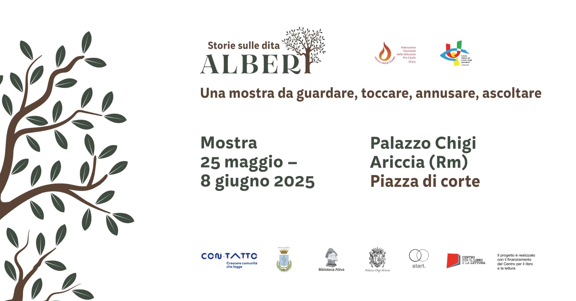 Storie sulle dita – Alberi – ARICCIA (RM) News Tutte le News 12 Maggio 2025 Storie sulle dita – Alberi – ARICCIA (RM) dal 25 Maggio all’8 Giugno – Palazzo Chigi, Piazza di corte, Ariccia Orari di Apertura al pubblico: Dal Martedì alla Domenica h: 10.00-13.00 e 15.30-18.30 Dal 25 maggio all’8 giugno 2025 sarà allestita nei saloni del piano mezzanino di Palazzo Chigi ad Ariccia (Rm), l’esposizione accessibile sulla natura intitolata “Storie sulle dita – ALBERI”, organizzata dalla Federazione Nazionale delle Istituzioni pro Ciechi Onlus. La mostra è ospitata all’interno del progetto di promozione della lettura CON-TA...