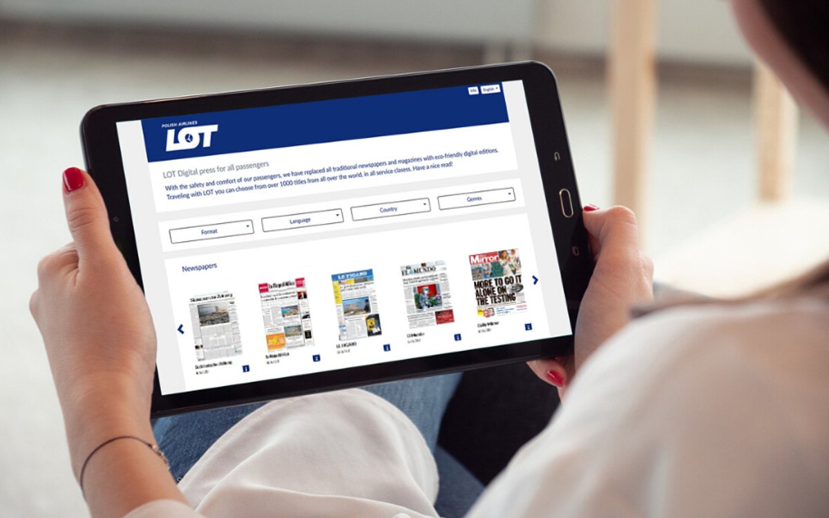 Reklama LOT jako jeden z pierwszych przewoźników lotniczych w Europie udostępnia pasażerom prasę w wersji cyfrowej – głosi jego komunikat. Są to dzienniki i magazyny w kilkudziesięciu wersjach językowych (między innymi polskiej, angielskiej, węgierskiej, chińskiej, czeskiej, duńskiej, hiszpańskiej, japońskiej i koreańskiej), a także magazyn pokładowy LOT-u „Kaleidoscope”. ...