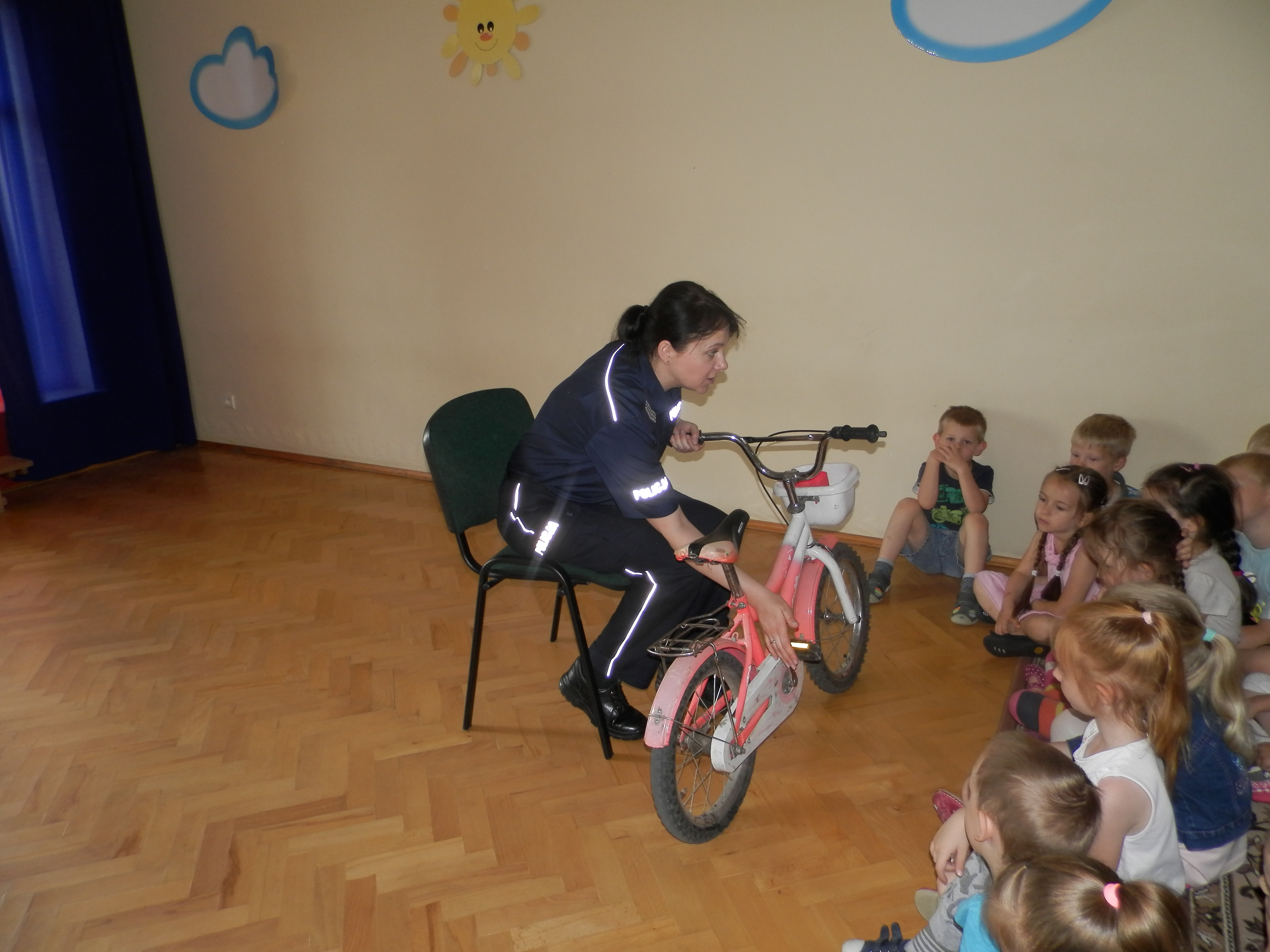 Podczas prelekcji policjantka rozmwaiał z przedszkolakami na temat bezpiecznego poruszania się po drodze, również rowerem, stosowaniem elementów odblaskowych i zapinaniem pasów bepzieczeństwa. Funkcjonariuszka prz...